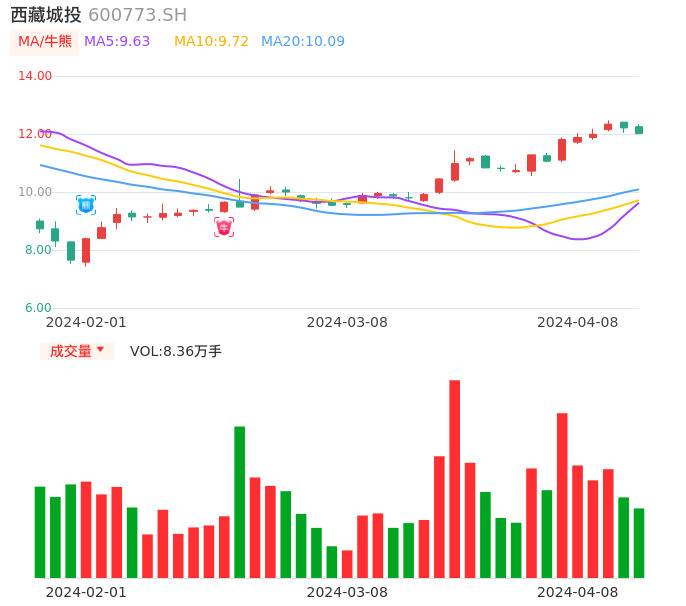 04月08日,西藏城投收报12.01,股价涨幅-1.64%,成交金额1.02亿元,换手率1.02%。