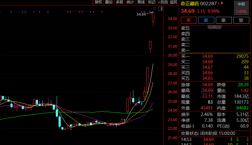 奇正藏药(002287)连续3日涨停,创近5年新高(复权,下同),今年以来累计大涨逾66%,昂利康、汉商集团、贵州百灵等均连续2日涨停。奥翔药业则连涨7日,五洲医疗、南新制药、百诚医药等逾10股连涨5日以上。辰欣药业、福元医药等创历史新高。