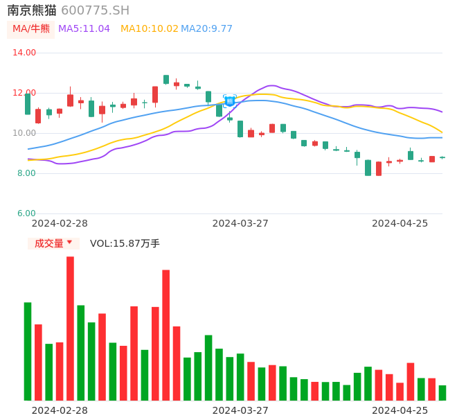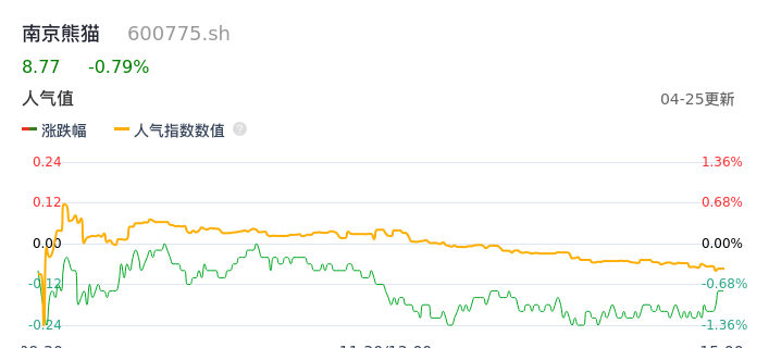 04月25日,南京熊猫收报8.77,股价涨幅-0.79%,成交金额1.39亿元,换手率2.36%。