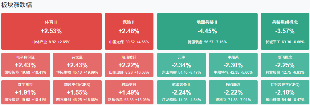 板块方面,保险、数字货币、脑机接口、证券等板块涨幅居前,军工、CPO、新疆、铜箔等板块跌幅居前。截至收盘,沪指涨0.2%,深成指跌0.15%,创业板指跌0.23%。