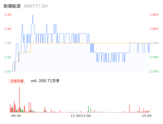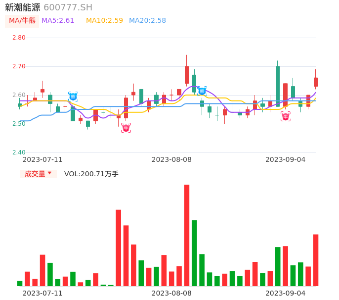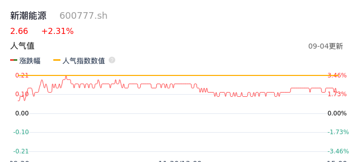 09月04日,新潮能源收报2.66,股价涨幅2.31%,成交金额5.33亿元,换手率3.15%。