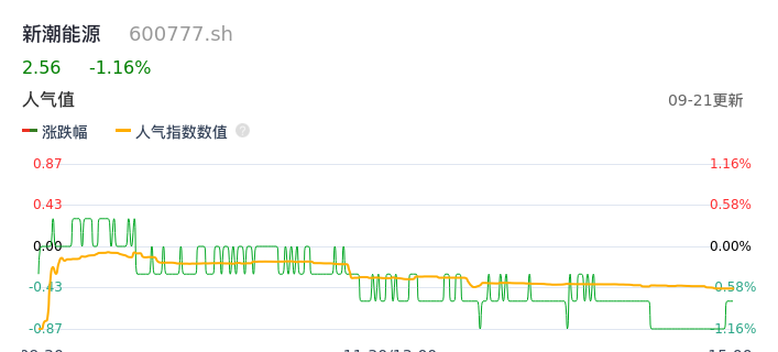 09月21日,新潮能源收报2.56,股价涨幅-1.16%,成交金额2.12亿元,换手率1.29%。