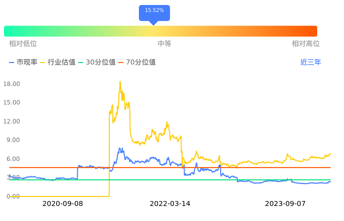2023年09月08日,新潮能源下跌0.77%收于2.57,今日成交金额2.32亿元。下文将从市盈率PETTM、市净率PB、市现率3个角度去分析公司估值情况。