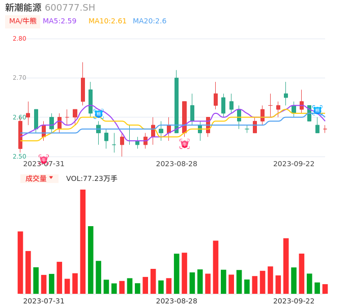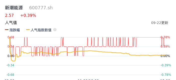 09月22日,新潮能源收报2.57,股价涨幅0.39%,成交金额1.98亿元,换手率1.21%。