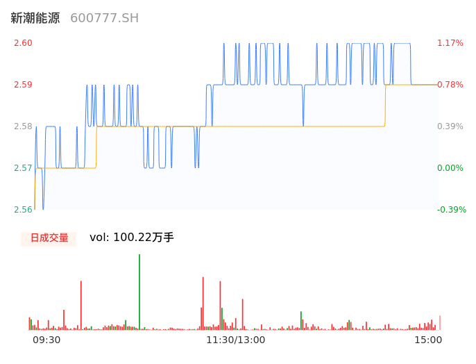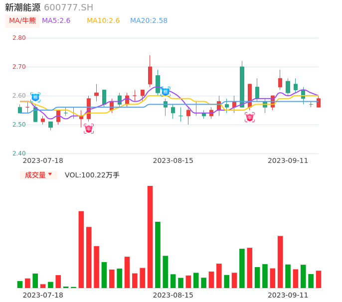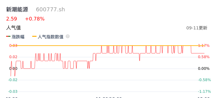 09月11日,新潮能源收报2.59,股价涨幅0.78%,成交金额2.59亿元,换手率1.57%。