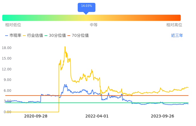 2023年09月26日,新潮能源下跌0.39%收于2.53,今日成交金额1.48亿元。下文将从市盈率PETTM、市净率PB、市现率3个角度去分析公司估值情况。
