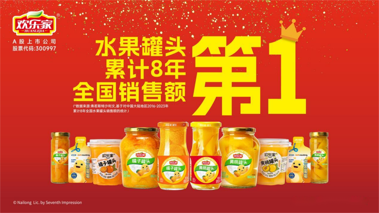 随着消费升级和“情绪价值”逐渐成为产业关键词,水果罐头正迎来新的发展机遇。欢乐家凭借水果罐头累计8年(2015-2023)全国销售额第一的市场地位,在产品、渠道与品牌力的三重支撑下,率先探索文化IP联名的深度融合路径。