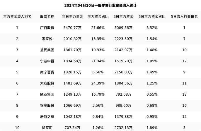 从主力资金流向来看,一般零售行业今日主力资金流入17.62亿元,在所有申万二级行业中排名:5/131。
