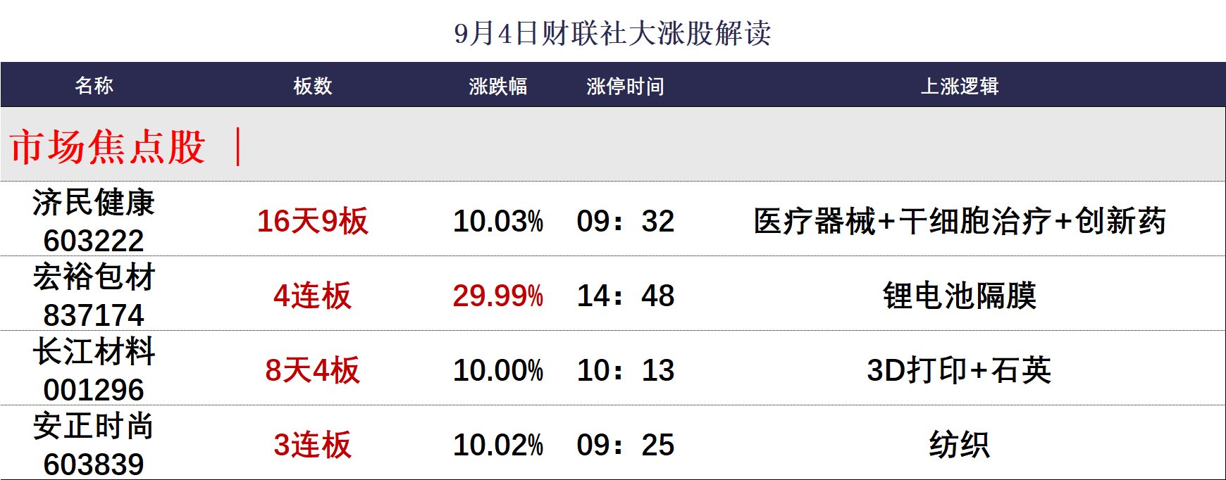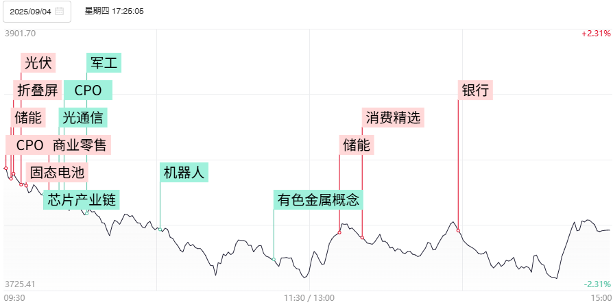 财联社9月4日讯,今日41股涨停,29股炸板,封板率为58%,北交所宏裕包材30cm4连板,安正时尚3连板,济民健康16天9板,长江材料8天4板,中国瑞林4天3板,东尼电子8天3板。市场全天震荡走低,创业板指领跌,科创50指数跌超6%。沪深两市全天成交额2.54万亿,较上个交易日放量1802亿。盘面上,市场热点较为杂乱,个股跌多涨少,全市场近3000只个股下跌。板块方面,零售、食品、造纸、光伏等板块涨幅居前,CPO、半导体、元件、军工等板块跌幅居前。截至收盘,沪指跌1.25%,深成指跌2.83%,创业板指跌4.25%。