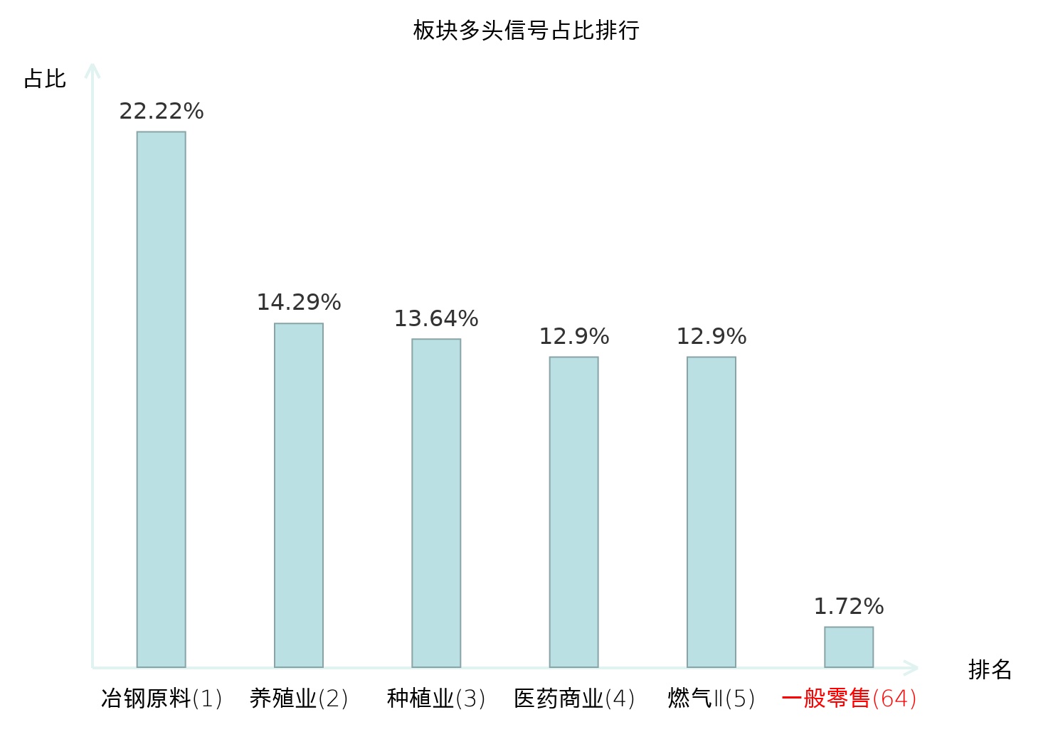 全市场所有行业板块中主力多头信号占比排名中,冶钢原料板块位居第一。航天装备Ⅱ板块名次提升最快,较昨日上升114位。