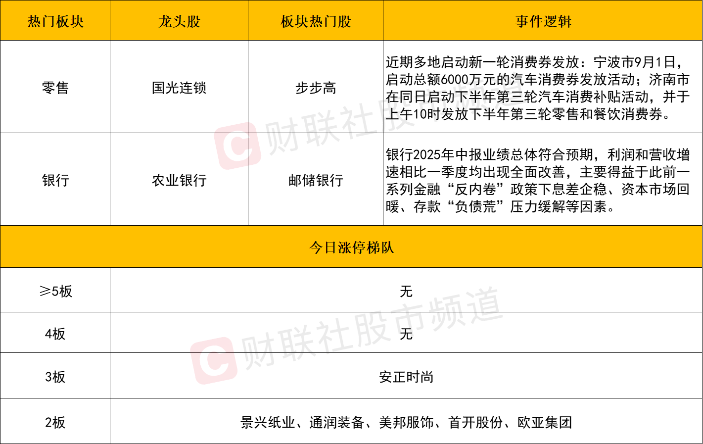 板块上,零售股逆势走强,国光连锁、百大集团、国芳集团、步步高、友好集团等个股涨停。