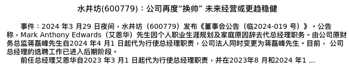值得注意的是:2024年03月方正证券的王泽华分析师,首次发布关于水井坊的研究报告,标题为:水井坊(600779):公司再度“换帅” 未来经营或更趋稳健。