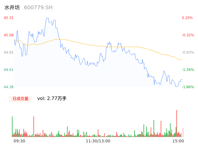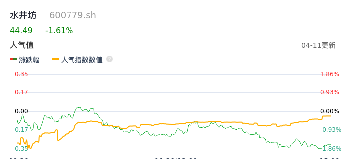 04月11日,水井坊收报44.49,股价涨幅-1.61%,成交金额1.24亿元,换手率0.57%。