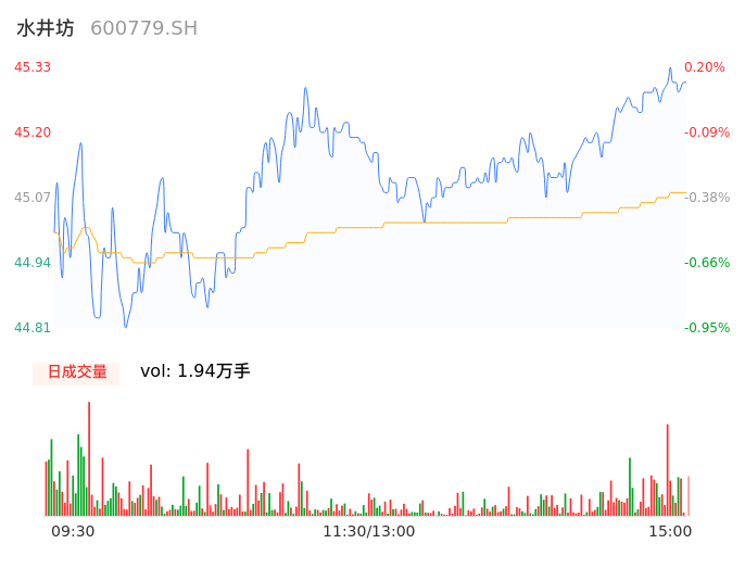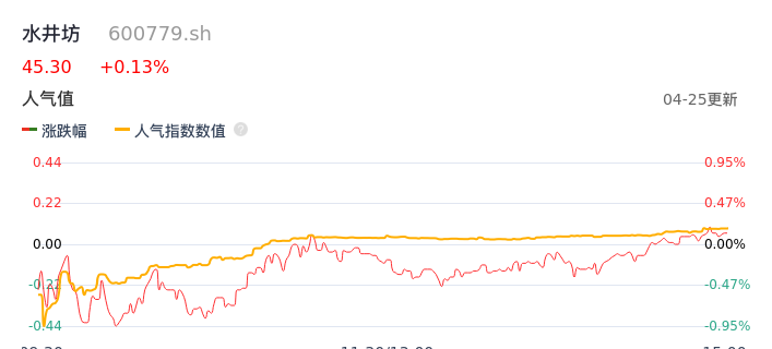 04月25日,水井坊收报45.30,股价涨幅0.13%,成交金额8760.26万元,换手率0.40%。