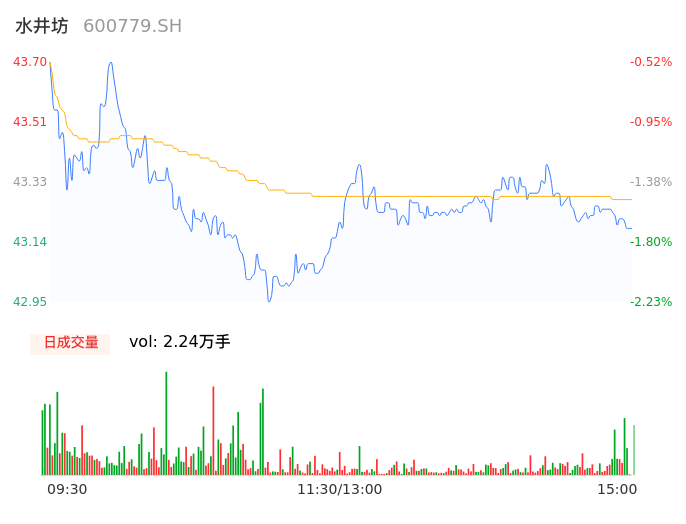 04月19日,水井坊收报43.17,股价涨幅-1.73%,成交金额9674.73万元,换手率0.46%。