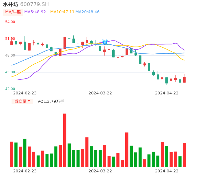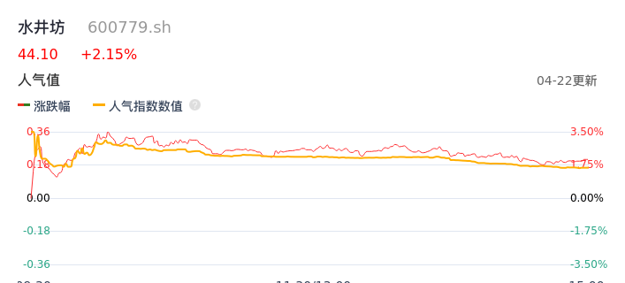 04月22日,水井坊收报44.10,股价涨幅2.15%,成交金额1.68亿元,换手率0.78%。