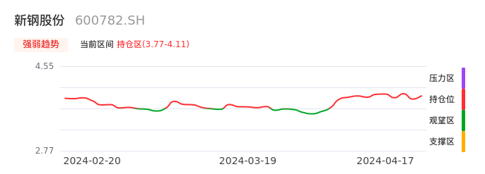 我们来看一下该股的九方特色指标强弱趋势的情况:新钢股份自04月01日从观望区上穿到持仓区。股价近期在多头区域持续强势上扬,上升动能仍较为充足,可积极关注。后续重点关注上方压力位:4.11元是否能突破上攻。