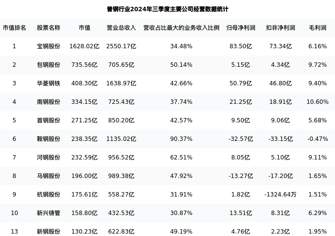 新钢股份最新报告期数据为三季度,下表汇总了普钢行业内市值靠前的公司三季度主要经营数据