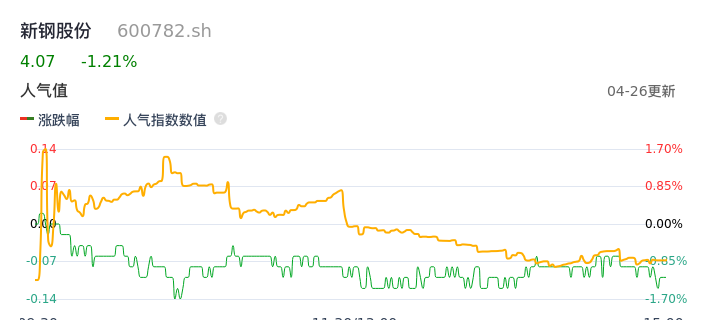 04月26日,新钢股份收报4.07,股价涨幅-1.21%,成交金额1.07亿元,换手率0.83%。