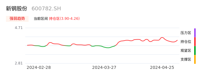 我们来看一下该股的九方特色指标强弱趋势的情况:新钢股份自04月01日从观望区上穿到持仓区。股价近期在多头区域持续强势上扬,上升动能仍较为充足,可积极关注。后续重点关注上方压力位:4.26元是否能突破上攻。