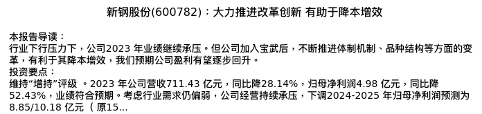 值得注意的是:2024年04月国泰君安的李鹏飞/魏雨迪/王宏玉分析师,首次发布关于新钢股份的研究报告,标题为:新钢股份(600782):大力推进改革创新 有助于降本增效。