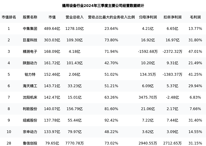 鲁信创投最新报告期数据为三季度,下表汇总了通用设备行业内市值靠前的公司三季度主要经营数据