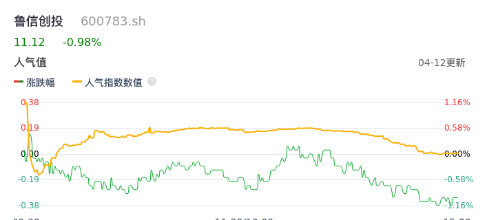 04月12日,鲁信创投收报11.12,股价涨幅-0.98%,成交金额1932.18万元,换手率0.23%。
