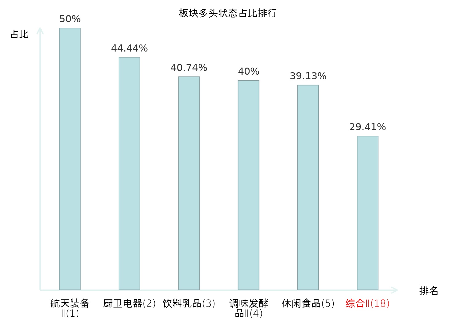 全市场所有行业板块中主力多头状态占比排名中,航天装备Ⅱ板块位居第一。林业Ⅱ板块名次提升最快,较昨日上升92位。