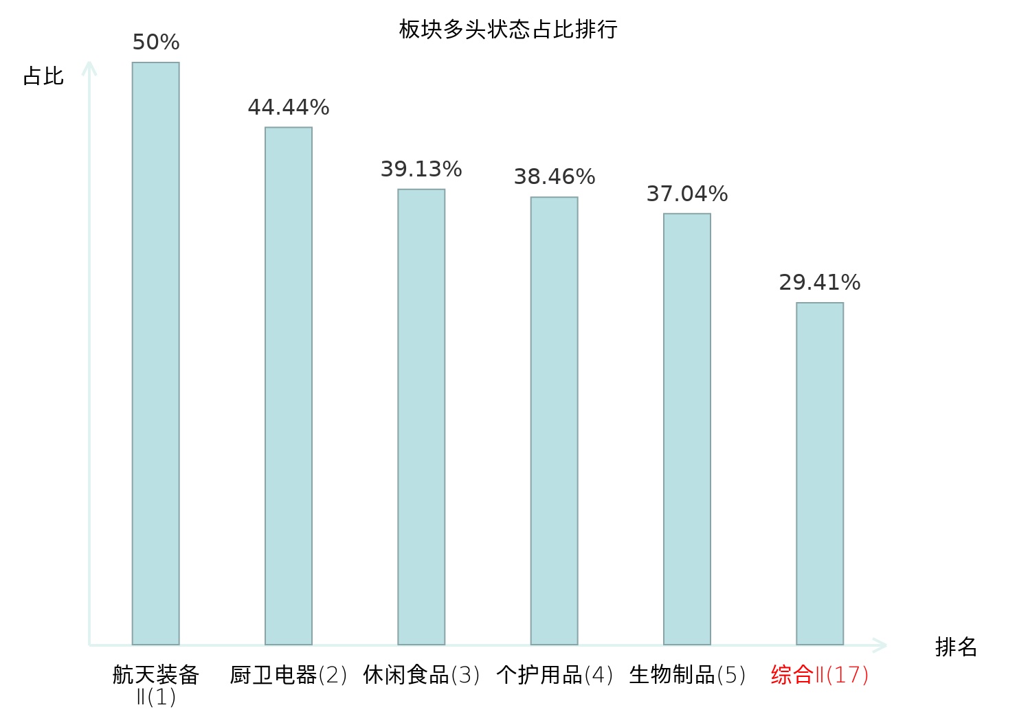全市场所有行业板块中主力多头状态占比排名中,航天装备Ⅱ板块位居第一。小金属板块名次提升最快,较昨日上升53位。