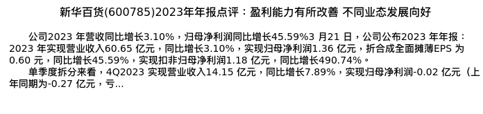 值得注意的是:2024年03月光大证券的唐佳睿/田然分析师,首次发布关于新华百货的研究报告,标题为:新华百货(600785)2023年年报点评:盈利能力有所改善 不同业态发展向好。