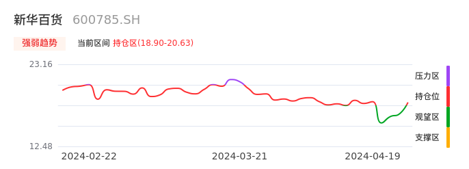 我们来看一下该股的九方特色指标强弱趋势的情况:新华百货近日从观望区上穿到持仓区。股价短期站稳多头区域,上升动能仍较为充足,可积极关注。后续重点关注上方压力位:20.63元是否能突破上攻。