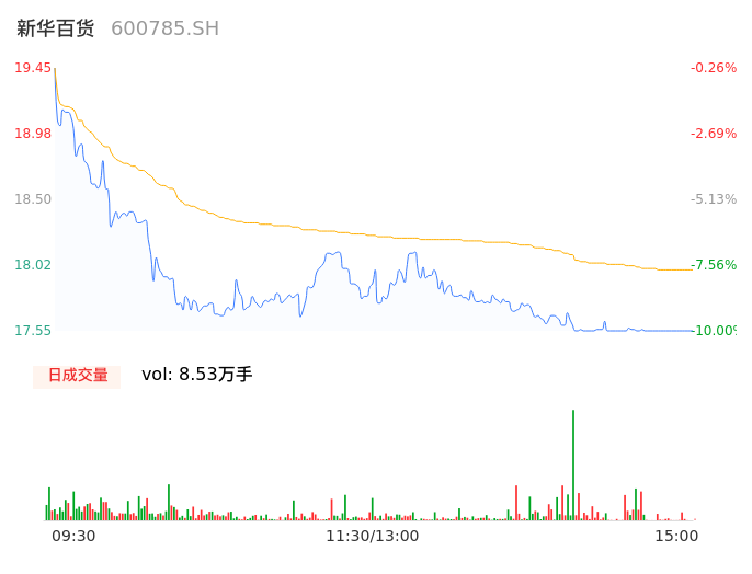 04月16日,新华百货收报17.55,股价涨幅-10.00%,成交金额1.53亿元,换手率3.78%。