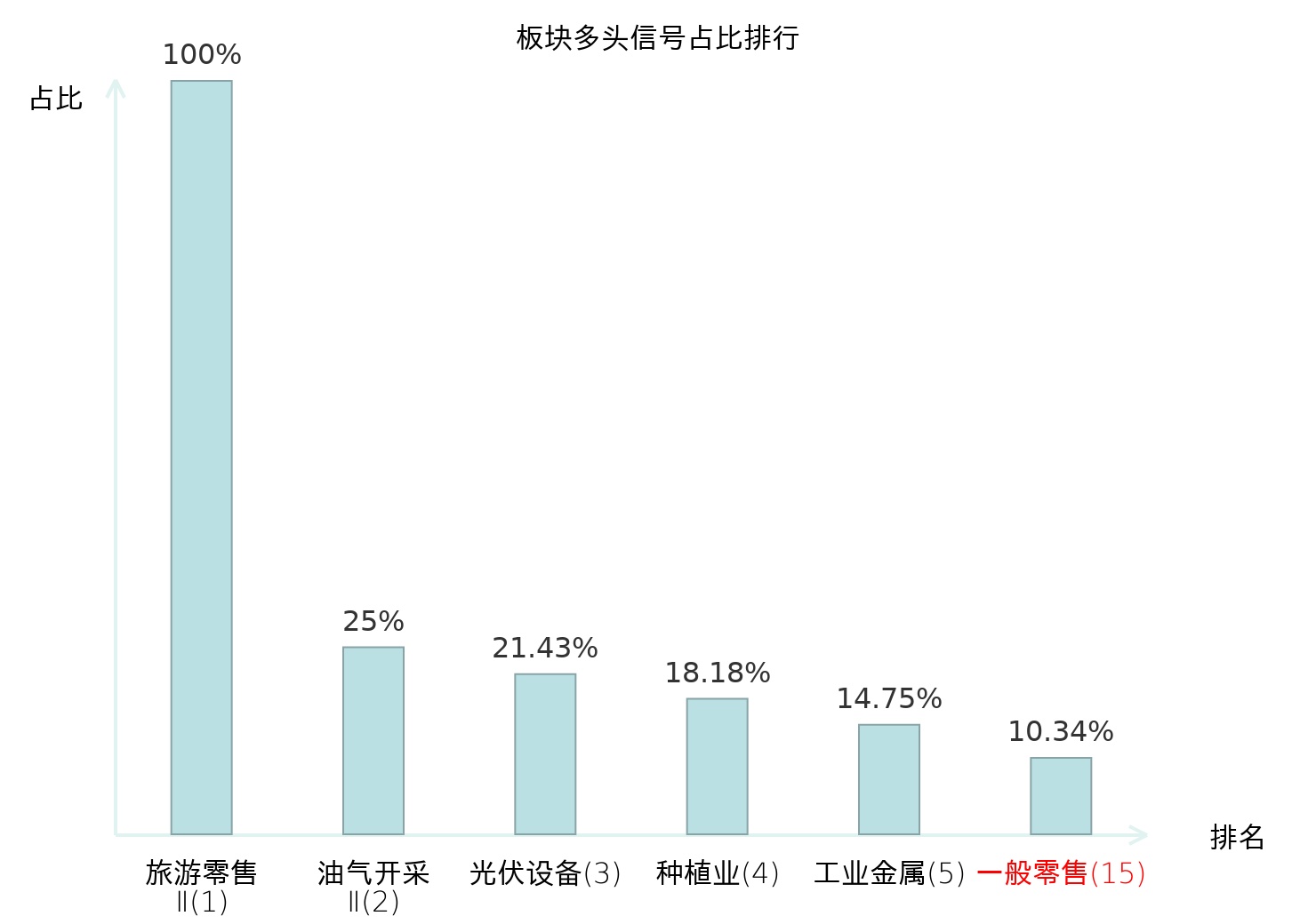 全市场所有行业板块中主力多头信号占比排名中,旅游零售Ⅱ板块位居第一。旅游零售Ⅱ板块名次提升最快,较昨日上升130位。