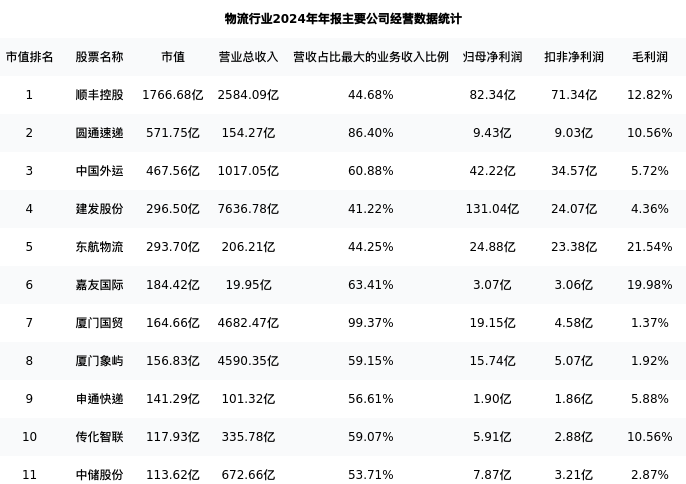 中储股份最新报告期数据为年报,下表汇总了物流行业内市值靠前的公司年报主要经营数据