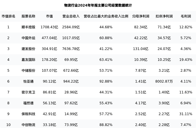 中储股份最新报告期数据为年报,下表汇总了物流行业内市值靠前的公司年报主要经营数据