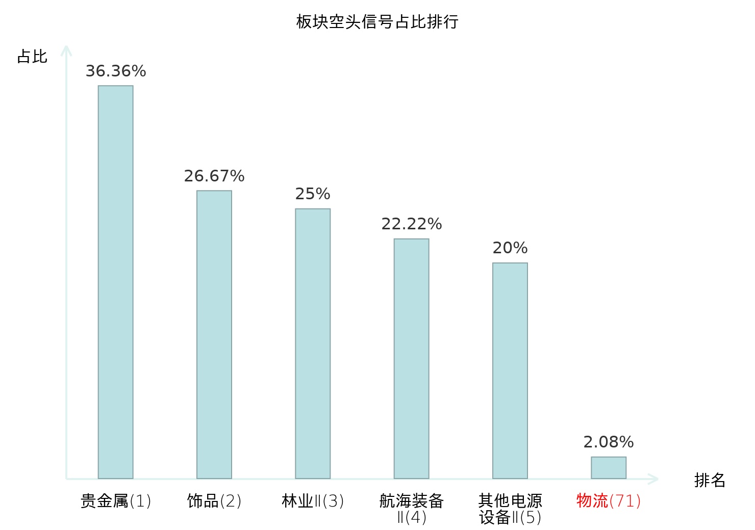 全市场所有行业板块中主力空头信号占比排名中,贵金属板块位居第一。工业金属板块名次提升最快,较昨日上升125位。