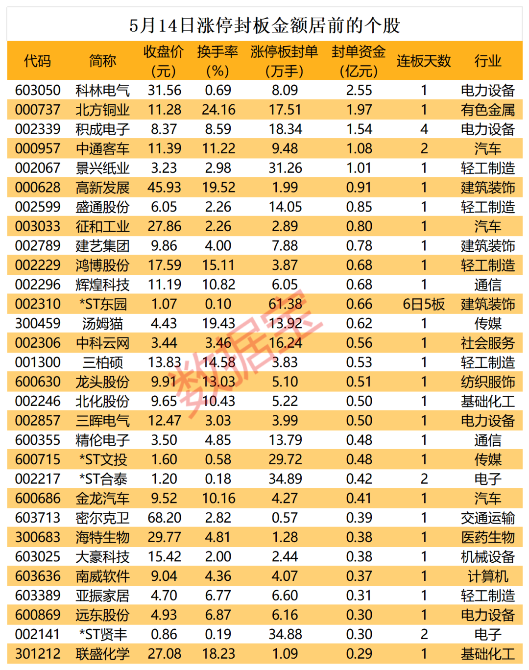 以封单金额计算,5股封单金额超亿元,科林电气、北方铜业、积成电子封单金额分别为2.55亿元、1.97亿元、1.54亿元。