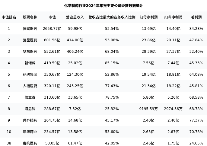 鲁抗医药最新报告期数据为年报,下表汇总了化学制药行业内市值靠前的公司年报主要经营数据