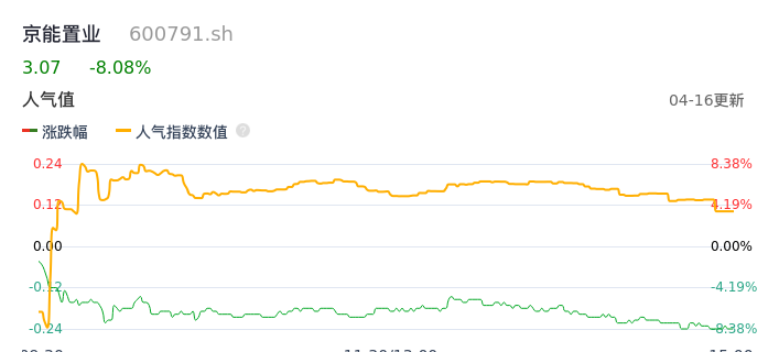 04月16日,京能置业收报3.07,股价涨幅-8.08%,成交金额3800.98万元,换手率2.68%。