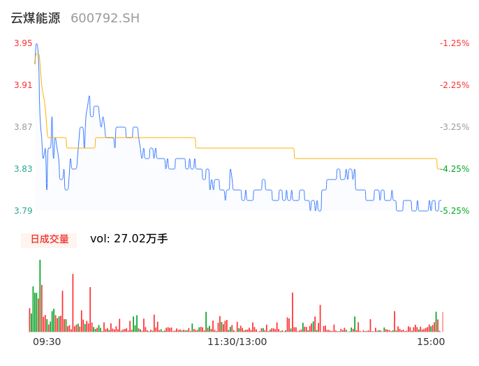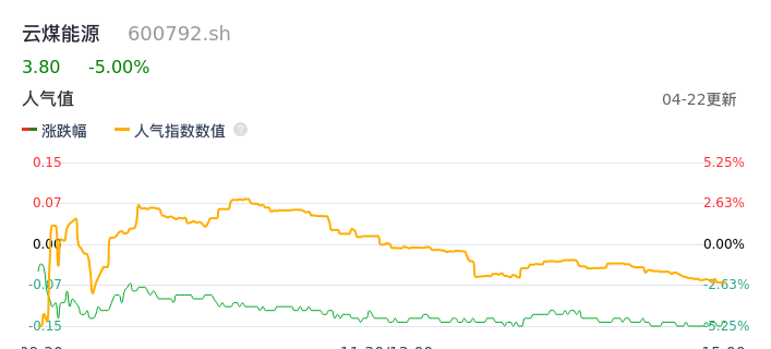 04月22日,云煤能源收报3.80,股价涨幅-5.00%,成交金额1.04亿元,换手率2.73%。