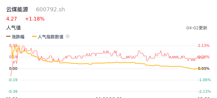 04月02日,云煤能源收报4.27,股价涨幅1.18%,成交金额8660.42万元,换手率2.05%。