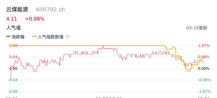 03月28日,云煤能源收报4.11,股价涨幅0.98%,成交金额4835.31万元,换手率1.19%。