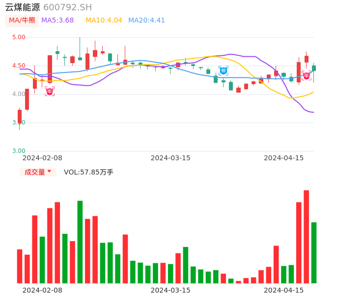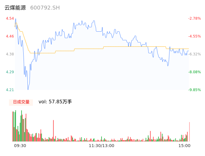 04月15日,云煤能源收报4.41,股价涨幅-5.57%,成交金额2.55亿元,换手率5.84%。