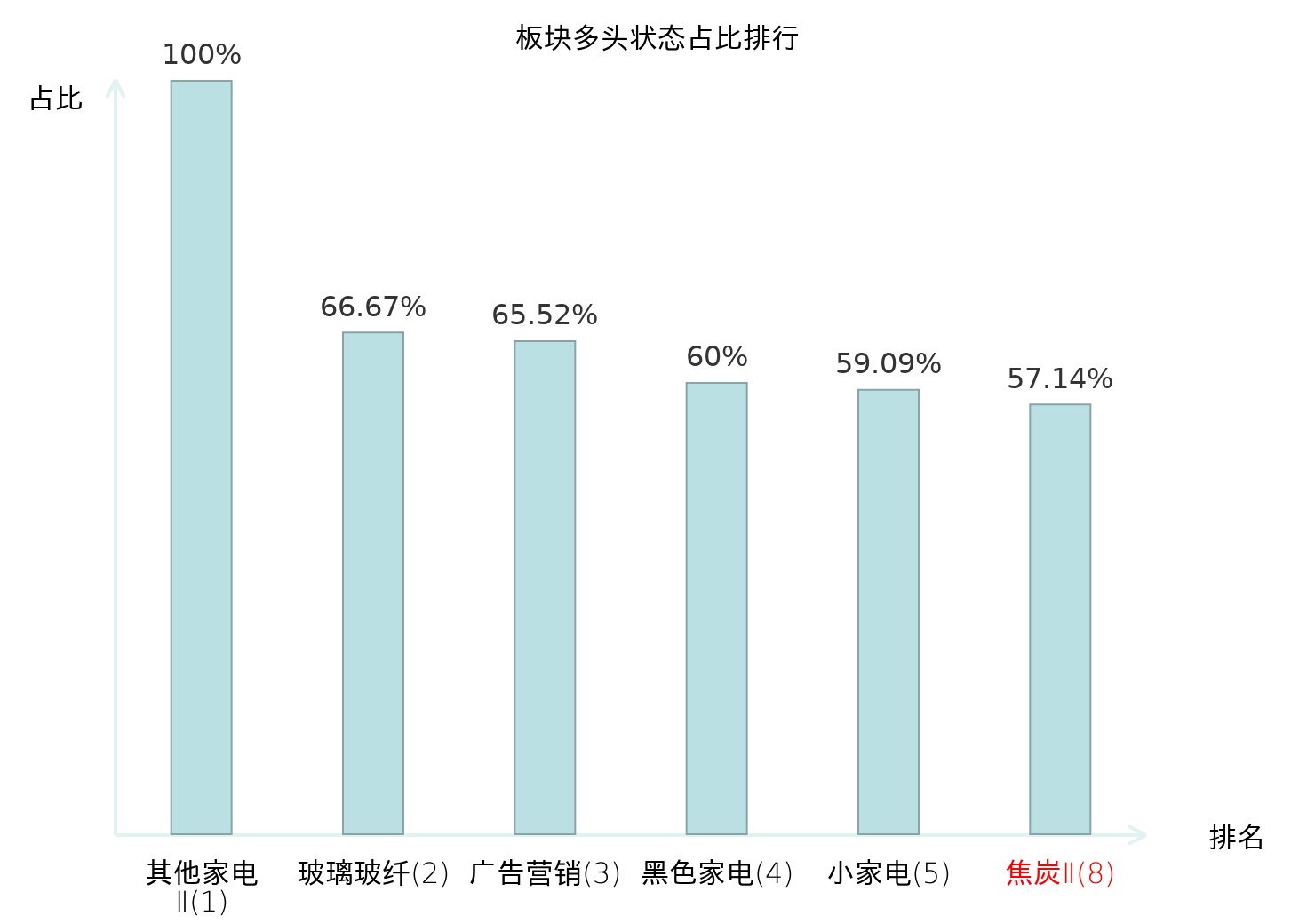 全市场所有行业板块中主力多头状态占比排名中,其他家电Ⅱ板块位居第一。航天装备Ⅱ板块名次提升最快,较昨日上升79位。