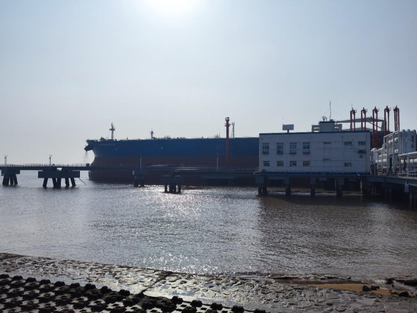 中化兴中石油转运(舟山)有限公司(下称“中化兴中”)是一家大型国际商用石油储运企业,也是上期所指定的首批原油期货交割库、380CST保税燃料油期货交割库和低硫燃料油期货交割库。公司现拥有总罐容297万立方米,建有3000至30万吨级油品转运码头共6座。连续多年公司保税燃料油直供量占舟山港区总体直供量超过50%。在中化兴中岙山岛的码头上,记者看到了正在卸油的VLCC超大型油船。