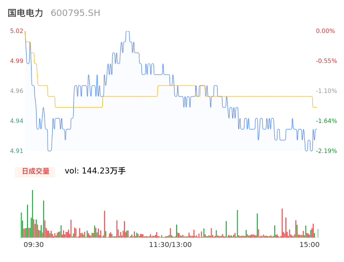 04月23日,国电电力收报4.92,股价涨幅-1.99%,成交金额7.15亿元,换手率0.81%。