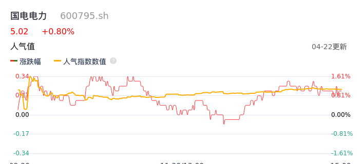 04月22日,国电电力收报5.02,股价涨幅0.80%,成交金额8.98亿元,换手率1.00%。