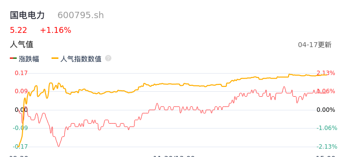 04月17日,国电电力收报5.22,股价涨幅1.16%,成交金额10.26亿元,换手率1.12%。