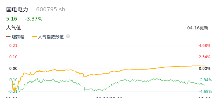 04月16日,国电电力收报5.16,股价涨幅-3.37%,成交金额12.57亿元,换手率1.36%。