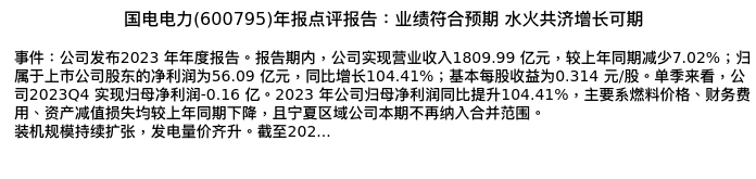 值得注意的是:2024年04月国盛证券的分析师,首次发布关于国电电力的研究报告,标题为:国电电力(600795)年报点评报告:业绩符合预期 水火共济增长可期。